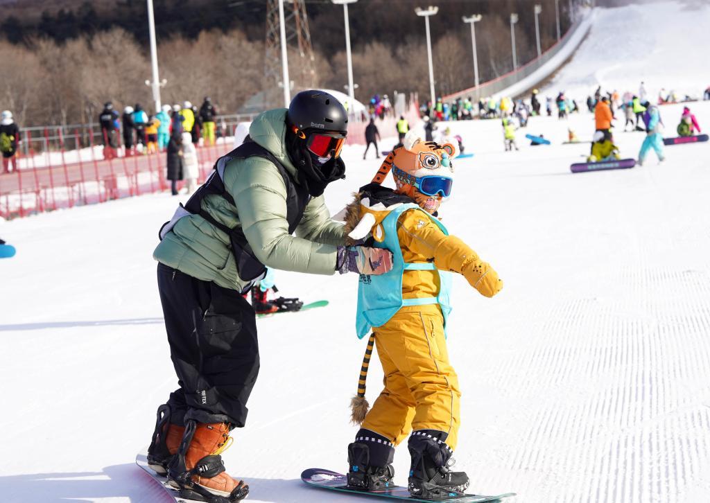 2025年12月3日,吉林市中小学生在“冰雪假期”期间,在吉林市纳美山谷度假区体验单板滑雪。新华社记者 颜麟蕴 摄